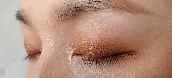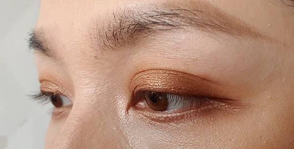 右眼則是用珠光的淺色打底,不會顯腫欸,然後用紅棕色珠光填滿眼窩,珠光香檳色打亮眼頭,再用手指沾珠光棕色塗眼睛中間,最後也一樣用深咖啡霧面加深眼尾。 (隨便畫都很好看欸!)