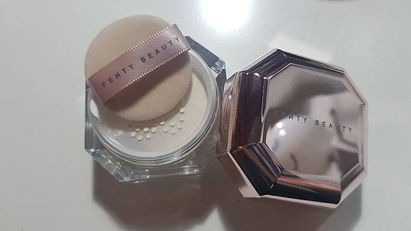 Fenty beauty的色號是butter,這是迷你size,7克多,第一次用有被驚豔到,粉質好細喔天啊,裡面有塊迷你粉撲,可愛但鳥蛋根本不會拿來用,孔洞是FB,滿好倒粉的。這蜜粉我記得有控油功能,所以我不能上太多,先眼下定妝,然後再上T字部位,修飾臉上的紋路效果滿好的,目前使用起來不會覺得太乾。
