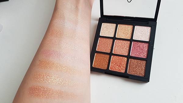 官網特價8折入手,覺得得意又划算,這盤沒有最深的顏色,也沒有可以打底的淺色,我曾經硬用畫眼妝,結果好拋喔!所以還是只能當搭配、疊加來使用,亮片色真的很漂亮,一次九個,還是很划算。