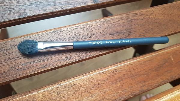 斜角修容刷:也是化纖毛,毛量豐厚而且不會太長,因此刷起來很有力道,是強中帶軟,亦柔亦剛的類型,非常好暈染,也不會刺膚,沒有異味,沾粉釋粉力都很優,我一用就愛上,果然是我一開始的目標物,沒讓我失望,它將會是我未來愛用的修容刷之一。滿分五顆星我給它八顆星!