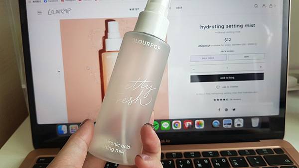 噴起來有椰子味道,滿特殊的,是會成膜的定妝噴霧,效果不錯但也沒有到很好用,主要是它的噴頭有夠爛,很不均勻,噴出來會有水柱。