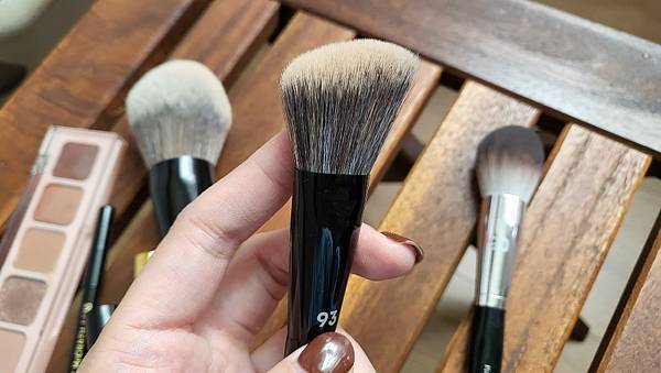 斜角刷,官方說是腮紅刷!我先拿刷腮紅,我用不習慣,位置不太好抓,我拿來當修容刷就很順手,位置也比較準,修容也滿好暈開的,所以我會拿來做修容刷用。