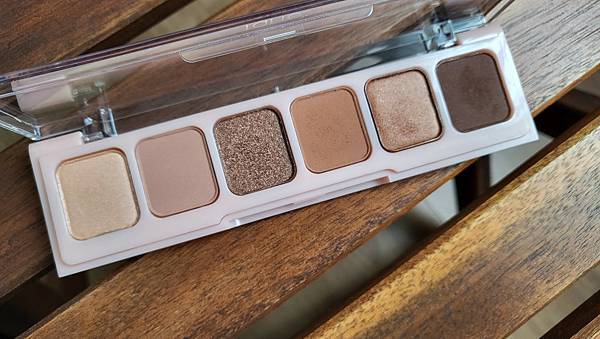 六色眼影,三色霧面三色珠光,粉質很不錯!壓得滿鬆的,沾取的時候會飛粉,霧面摸起來有點軟軟的,真有趣,珠光色超美超亮!