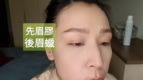 另外來看到左邊,也是五分鐘左右就躺平,這時再用眉膠補上眉毛,會覺得卡卡黏黏的,還是可以上色,但就是不好掌握眉型,很彆扭啦!