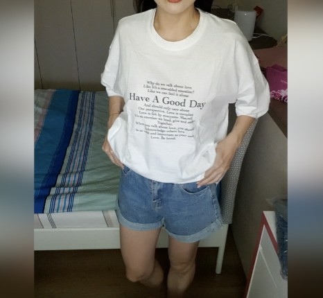 版型好看的短袖長T,淺色好搭,上面的英文字也可愛,我會特地看一下內容,太瞎的不買,這件也是特價才買得起,原價真的比較高。