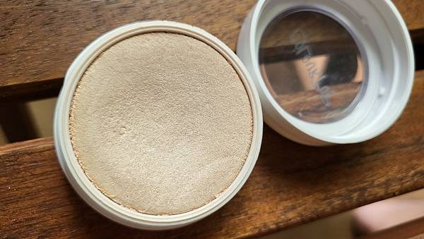 這塊沒有附粉撲、刷出來的粉有珠光,上在臉上不會亮亮的,很快就融進我的皮膚,有趣的是:它讓我的臉好滑。像是鋪上了什麼滑滑粉。