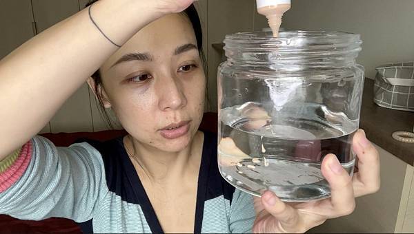 我先拿一個透明的玻璃罐,加水,然後把粉底液,擠進去,那樣子實在不美麗,散開,沾到罐子的邊邊,變好髒,粉底液也沒有團結在一起,反而是散開在我的玻璃罐的底部角落,我不知所措,光撈起來就很花時間,一次只能撈起來一點點,我不知道我在幹嘛,怎麼跟我看得影片差那麼多。