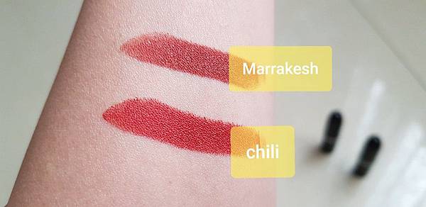 <div><br></div><div>大家好,胎嘎厚!</div><div><br></div><div>影片好看</div><div>https://youtu.be/OfgbyO_Q2ew</div><div><br></div><div>MAC子彈唇膏紅超久,紅到我都不自覺地入手兩支,色號還堪稱姊妹色,我是在為難自己沒錯。</div><div><img src="https://pic.pimg.tw/frankielazy/1549085824-1879385110_n.jpg" alt=""><br></div><div><br></div><div>實際試色,很明顯看得出來有差別<br></div><div><img src="https://pic.pimg.tw/frankielazy/1549086111-1798838615_n.jpg" alt=""><br></div><div>Chili就是比較紅,番茄紅,有點俏皮,性感中的調皮,一年四季都可以擦。</div><div><br></div><div>Marrakesh楓葉紅,帶棕色多一點,有心事的感覺,適合秋冬。</div><div><br></div><div><img src="https://pic.pimg.tw/frankielazy/1549086119-1389969363_n.jpg" alt=""><br></div><div>質地都是Matte 霧面感,秋冬就是很適合霧面,有質感多了。</div><div>兩支我都喜歡,因為工作的關係,所以我天天擦也不會奇怪。</div>